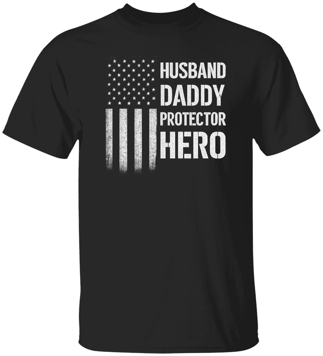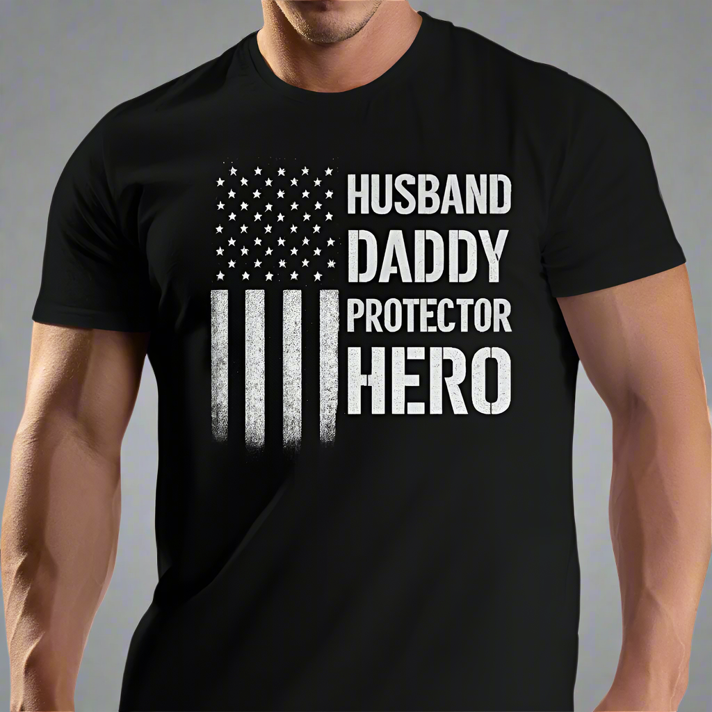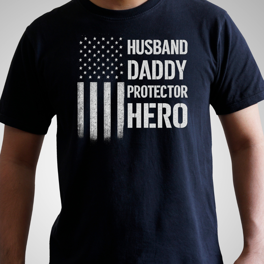 Celebrate the everyday hero in your life with this bold and rugged tee that says it all: Husband. Daddy. Protector. Hero.
